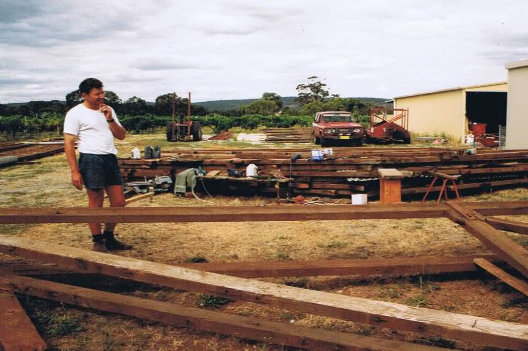 If I was to make a go of this business we were going to need more area to work in, we had little room to store barrels. I found out in Osborne Park there was a man who owned a salvage yard. I walked in there one day and I said "Have you any trusses for sale? I'm thinking of building something back at my place at the winery". He said "There's this guy up in Toodyay, he has a sheep shearing shed and all his trusses have fallen down and he wants to sell them all off to send his kids to school". So Katrina and I drove up there to have a look at them and as soon as I saw them I thought, yeah I can do something with this. I booked a big semi truck, went up there and bought these trusses for $250 each, stacked them up and started designing our back processing area. It was a piece of cake for me because I had 30 years of experience in construction. I just needed a good carpenter, and that was a father/son team.